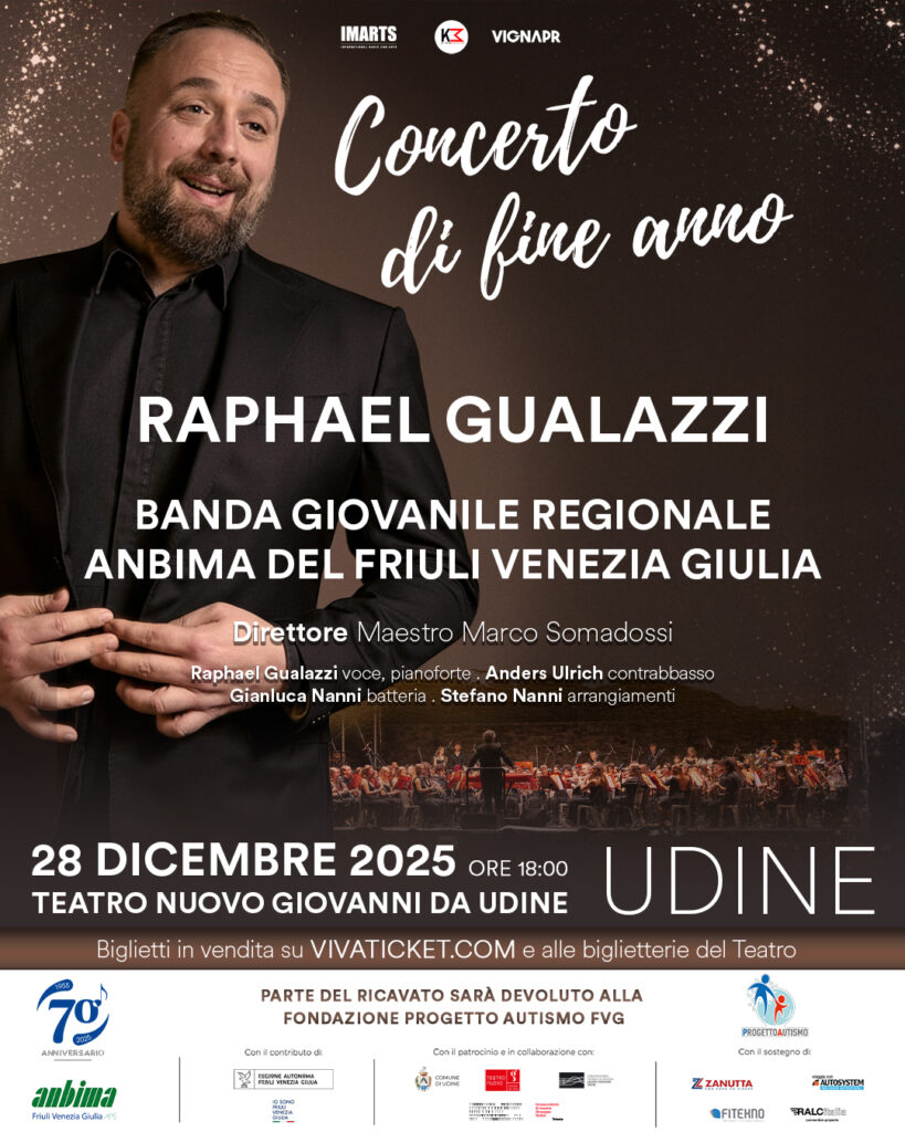 Sarà la musica a chiudere in bellezza l’anno del 70° anniversario di ANBIMA, l’Associazione Italiana delle Bande Musicali. Domenica 28 dicembre alle ore 18.00, il prestigioso palco del Teatro Nuovo Giovanni da Udine accoglierà uno degli eventi più attesi delle festività: il Concerto di Fine Anno della Banda Giovanile Regionale ANBIMA FVG, con un ospite d’eccezione, Raphael Gualazzi.