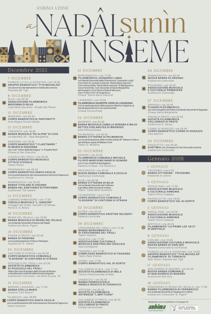 Gli eventi iniziano il 7 dicembre con Il Gruppo Bandistico “Tita Michelas” e si conclude il 18 gennaio con la Banda Filarmonica di Vergnacco”.