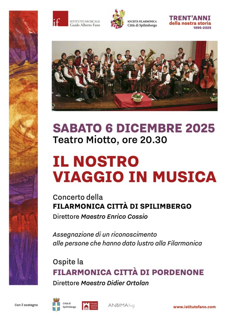 La SOCIETÀ FILARMONICA Città di Spilimbergo ci invita al suo concerto dal titolo “IL NOSTRO VIAGGIO IN MUSICA” che si terrà sabato 6 dicembre presso il Teatro Miotto alle ore 20.30.