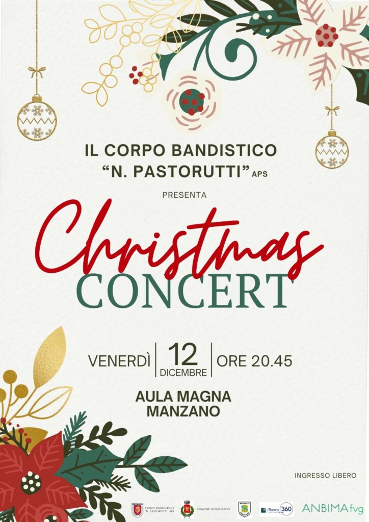Il Corpo Bandistico “N. Pastorutti” di Manzano ci invita al concerto “Christmas Concert”, che si terrà venerdì 12 dicembre 2025 alle ore 20.45 presso l’Aula Magna delle Scuole Medie di Manzano(via Pietro Zorutti, 21)