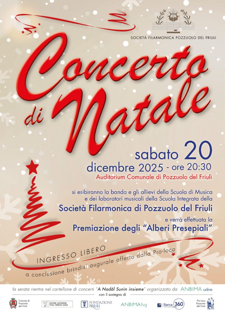 La Filarmonica di Pozzuolo del Friuli è lieta di invitarci al tradizionale Concerto di Natale che si terrà sabato 20 dicembre 2025, alle ore 20:30, presso l’Auditorium Comunale di Pozzuolo (via delle Scuole 10).