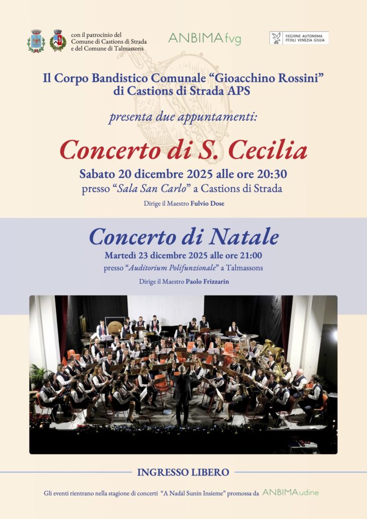 Il Corpo Bandistico Comunale “G.Rossini” di Castions di Strada APS ci invita al tradizionale Concerto di Santa Cecilia, che si terrà sabato 20 dicembre 2025 alle ore 20:30 presso la Sala San Carlo di Via Roma, 47 a Castions di Strada.