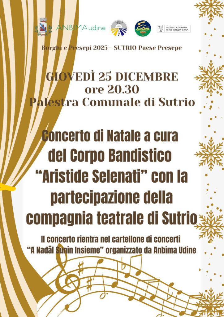 Il Corpo Bandistico Aristide Selenatidi Sutrio ci invita la “Concerto di Natale” che si terrà presso la palestra comunale di Sutrio il 25 dicembre alle ore 20.30.
