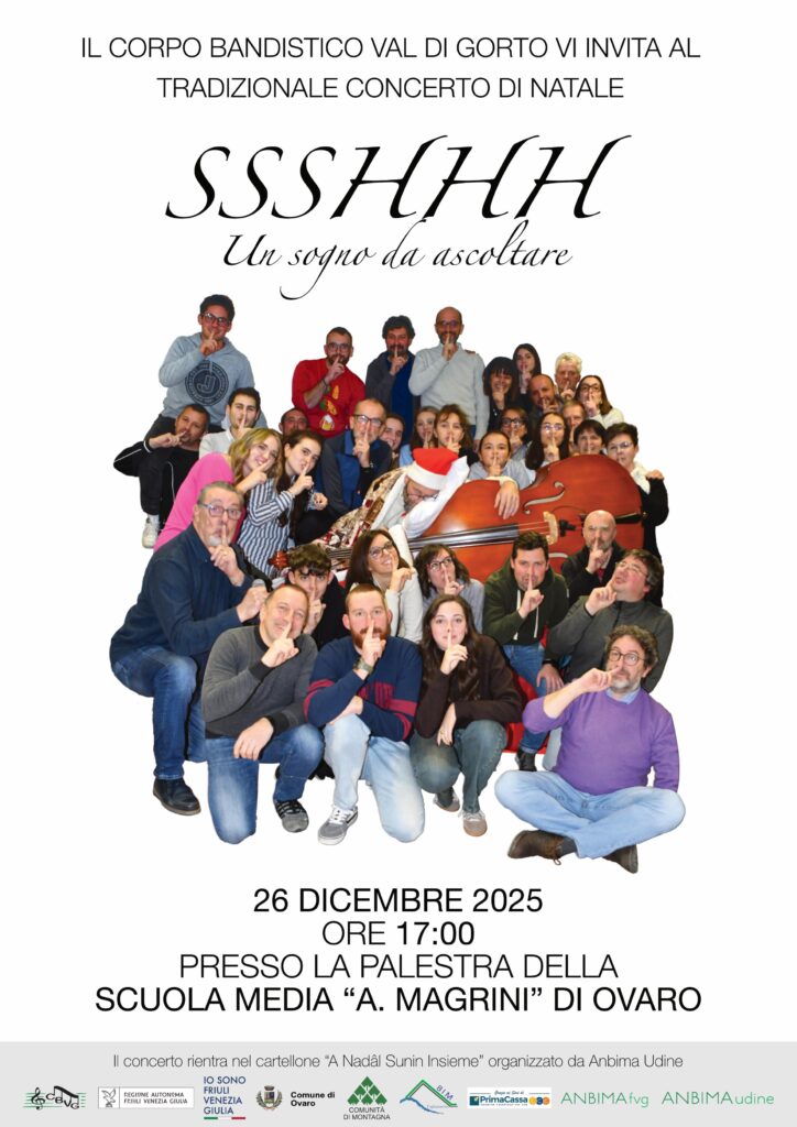 Il Corpo Bandistico “Val di Gorto” ci invita al tradizionale Concerto di Natale che si terrà venerdì 26 dicembre 2025 alle ore 17:00 presso la palestra della Scuola Media “Aulo Magrini” di Ovaro.