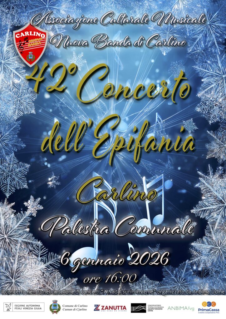 L’ Associaizone Culturale Musicale Nuova Banda di Carlino ci invita al “42° Concerto dell’Epifania” che si terrà il giorno martedì 6 Gennaio 2026 alle ore 16:00 presso la palestra comunale di Carlino.