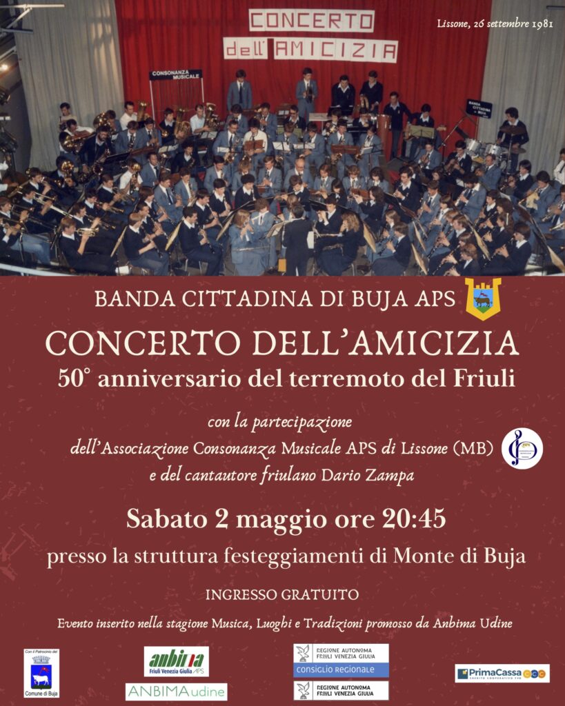 In occasione del 50° anniversario del terremoto del Friuli la Banda Cittadina di Buja ci invita al “Concerto dell’amicizia” che si terrà sabato 2 maggio alle ore 20:45 presso la struttura festeggiamenti di Monte di Buja.
